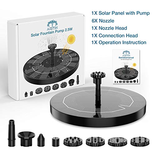 Details: AISITIN 2.5W Solar Fountain Pump, Solar Bird Bath Fountain with 6 Nozzles, Solar Water Fountain for Bird Bath, Garden, Ponds, Pool, Fish Tank, Outdoor