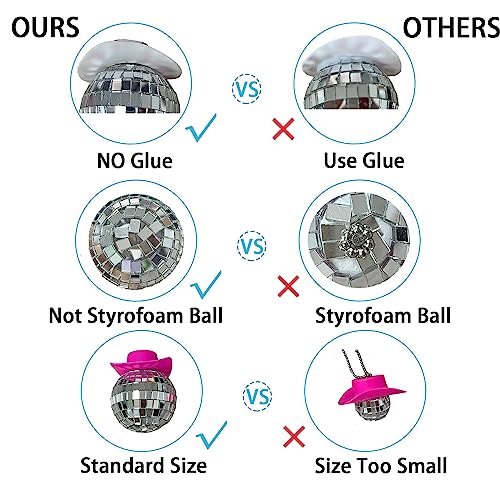 • DISCO BALL CAR ACCESSORY: This disco ball car mirror ornament ​is consisting of pink cowboy hat and disco mirror ball. When the sun hits the bling Glass ball car accessory, the interior of the car will sparkle, the light reflects in your car will makes you very happy, especially on the way to work.