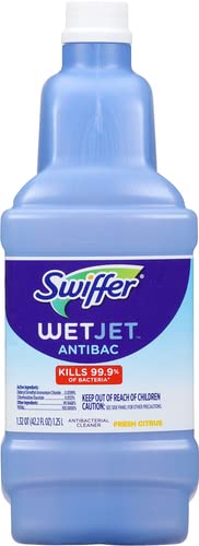 Details: Swiffer WetJet Antibacterial solution Kills 99.9% of Bacteria*. This fast-drying, specially made solution dissolves dirt and tough, sticky messes and comes in a fresh citrus scent. *Limited Disinfectant. Kills Salmonella enterica on hard non-porous surfaces
